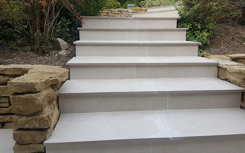 We used high quality white porcelain slabs with a contrasting dry stone wall to make a safe passage to the second tier and to maintain the existing bedding areas and plants.