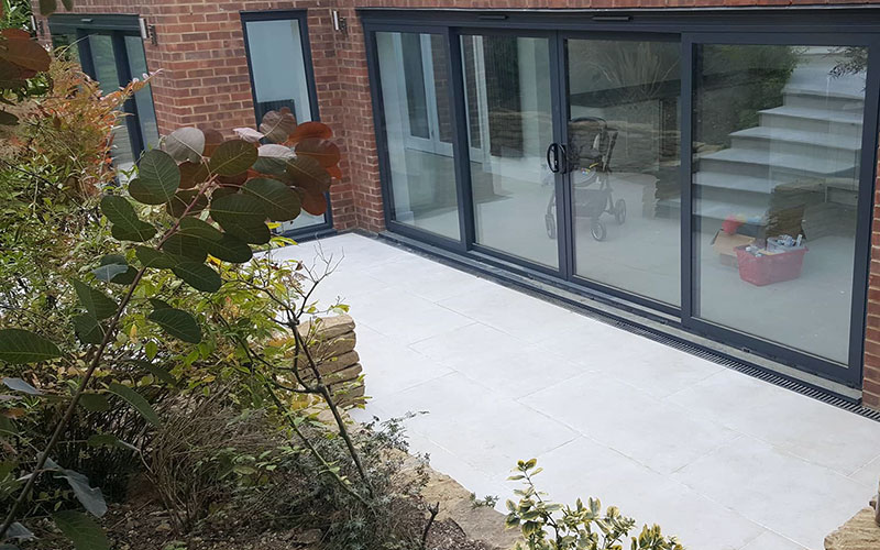 The client now has a small patio area to look out onto from the comfort of her summer house during the colder months of the year. An overhang on the roof provides a shaded seating area in the summer.